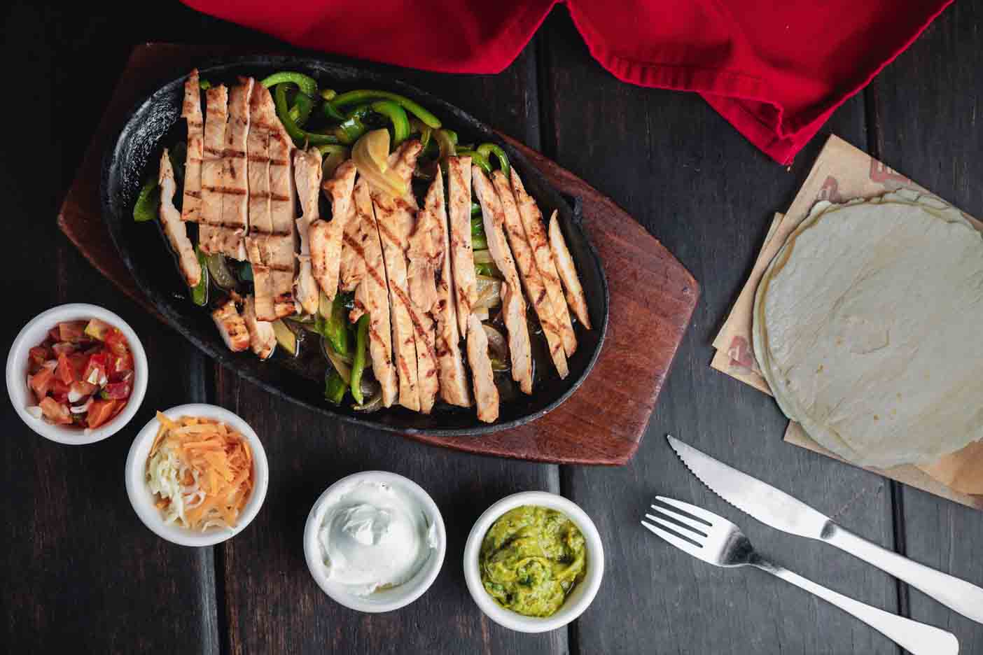 Grilled chicken slices topped with grilled onion and pepper. Served with tortilla bread, sour cream, mexican tomato mix, avocado mix and cheddar cheese.