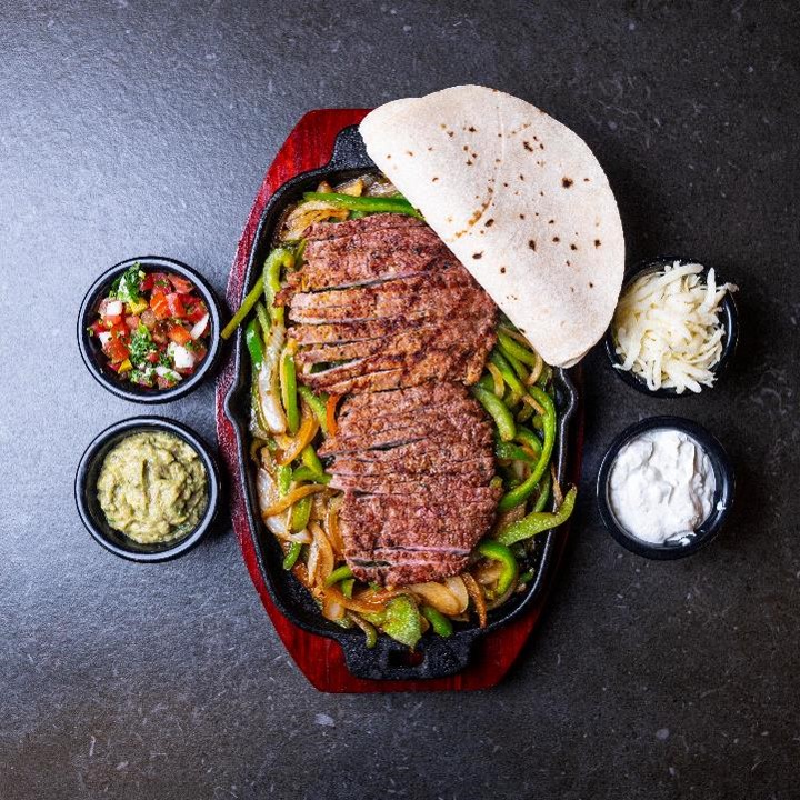 قطع فيليه مشوية مع بصل مشوي وفليفلة. تقدم مع خبز تورتيلا, ساور كريم, خلطة بندورة مكسيكية, خلطة افوكادو وجبنة شيدر