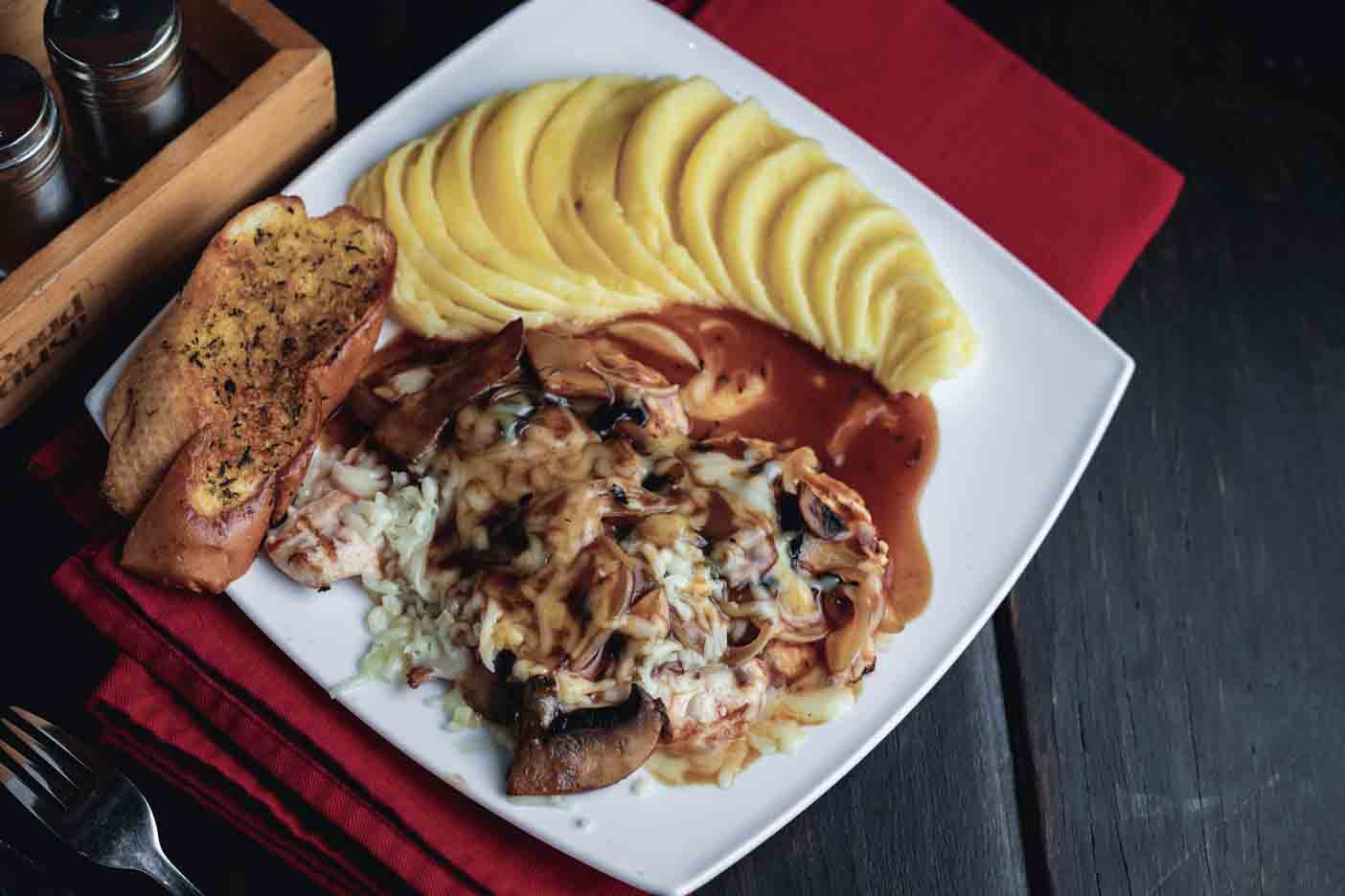Grilled chicken breast topped with mozzarella cheese, mushroom and onion sauce. Served with mashed potato or mexican rice and garlic bread.