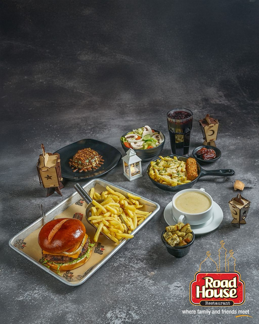 Your Choice of Beef Burger (Oklahoma Burger – Original Cheeseburger) + House Salad + Provencal Potatoes + Mozzarella + Potato Soup + Dates + Jallab + Mini Pistachio Pancake