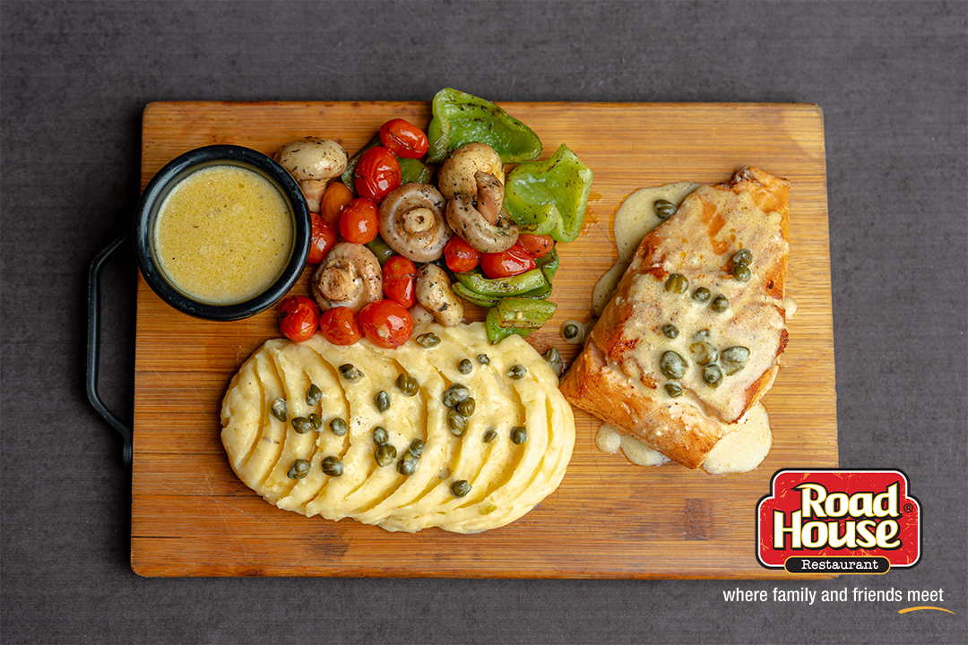 فيله سالمون مشوي مع صوص البيكاتا والكابر – بطاطا بوريه – خضار مشوية