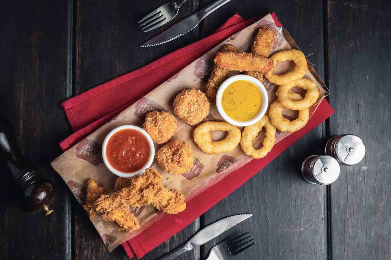 حلقات البصل – أصابع الدجاج – موزاريلا ستيك – كرات ماك & تشيز. تقدم مع صوص الهاني مسترد